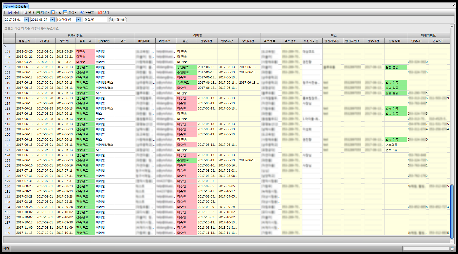 거래처별로 청구서를 일괄로 전송가능합니다. 메일과 팩스 기능 지원하며, 청구서의 전송시간 및 전송상태를 확인 할 수 있습니다.해당 내역을 재전송가능하며, 전송된 거래처별로 엑셀로 청구서를 내보내어 블루시스PAY에 등록할 수 있습니다.